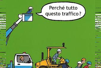 La giornata è grigia. Piove. Il cantiere, che da molti mesi accompagna il paesaggio accanto alla nostra libreria, è momentaneamente fermo. Piccole pozze d'acqua disseminate tra le lastre di pietra. Un bambino, con un ombrello verde cangiante, obbliga la madre a rimanere accanto accanto alla rete metallica che circoscrive l'area dei lavori, sperando di vedere le macchine al lavoro. Dichiara una passione per le ruspe, le gru, i martelli pneumatici, per le betoniere. E allora, nella giornata d'autunno in cui la meteorologia obbliga i mezzi al silenzio, suggeriamo alcuni titoli da mettere nella biblioteca dei curiosi. Partiamo da Perché tutto questo traffico?, in catalogo per Babalibri. Il divertente libro, firmato da Tomoko Ohmura, mette in campo tutto i mezzi di trasporto possibili in una fila che si è creata per un evento straordinario.