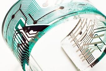Vecchie parti di computer incastonate con un materiale trasparente come l’acqua e trasformate in bracciali, anelli e pendenti.