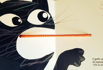 Le illustrazioni dai contorni netti si appoggiano sulle pagine a sfondo bianco come se fossero di passaggio, come a suggerire il movimento sfrenato dell’inseguimento, l’appostarsi quatto quatto del gatto che prelude al balzo, lo sbatter d’ali della libellula, veloce, lieve. Oltre al rosso del filo, dominano il nero del gatto e l’arancio della libellula ma in essi ci sono delle venature leggere di colore che variegano le immagini dando loro profondità, conferendo a ciascuna di esse un movimento; mentre il filo sottolinea una direzione, la quale, tendendolo più o meno, all’improvviso cambia. Per questo albo, che consiglio dall’anno in su, ci sarà un piccolo lettore, un genitore voce narrante e un aiutante, il filo rosso, a suggerire, sorprendere.