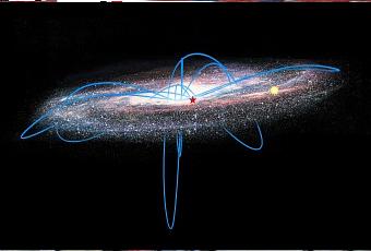 L’immagine mette in evidenza, in celeste, la possibile orbita della stella MACHO 176.18833.411 nel corso dell’ultimo miliardo di anni all’interno della nostra Galassia. Il simbolo giallo rappresenta la posizione del sole, mentre l’asterisco rosso la posizione attuale della stella. Crediti: AIP / J. Fohlmeister, A. Kunder