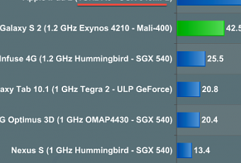 Una recente serie di test GLBenchmark da Anandtech (grafico sopra) mostra quanto più veloce sia la GPU dell’ A5 rispetto a quella dell’A4, almeno rispetto alle prestazioni grafiche.