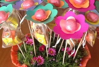 Buongiorno!!!Per un compleanno di bimba: un cestino di fiori con caramelle da regalare agli invitati della festa.