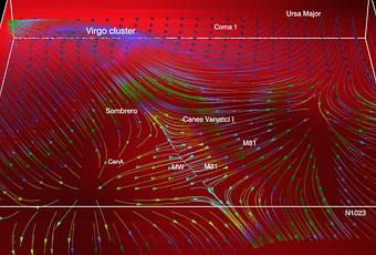 Utilizzando i migliori dati disponibili per il monitoraggio del traffico galattico, Noam Libeskind del Leibniz Institute for Astrophysics Potsdam (AIP) e i suoi collaboratori hanno costruito una mappa dettagliata del moto delle galassie nei nostri dintorni. Nella loro ricerca hanno scoperto un ponte di materia oscura che si estende dal nostro Gruppo Locale fino all’ammasso della Vergine, un enorme ammasso contenente circa 2.000 galassie a 50 milioni di anni luce da noi. Il ponte di materia oscura sembrerebbe essere legato ai due estremi da grandi bolle completamente prive di galassie. Questo ponte e questi vuoti ci aiutano a chiarire un problema di almeno 40 anni che riguarda la curiosa distribuzione delle galassie nane.