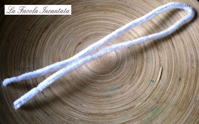nettapipa di ciniglia2 perle di legno grandi (una di legno chiaro)8 perle medie10 perle piccolecampanellafeltrocolla a caldoforbici.Procedimento:Per realizzare sciarpa e cappello