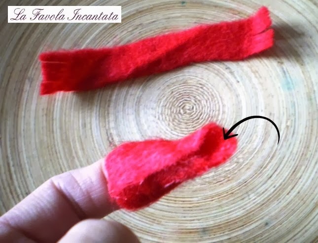 Tagliate nel feltro un quarto di cerchio del raggio di circa 4 cm (dipende ovviamente dalla dimensione della vostra perla) e ricavatene un cono. Chiudete il cono con la colla a caldo (o con una semplice cucitura) lasciando una piccola apertura sulla punta. Per la sciarpa tagliate un striscia di feltro lunga circa 10 cm e alta 0,5 cm e sfrangiate le estremità. Praticate un taglietto a circa 4 cm affinché un’estremità della sciarpa possa passarci attraverso e fissarsi attorno al collo dell’elfo.Per realizzare il corpoPiegate un nettapipa a metà.