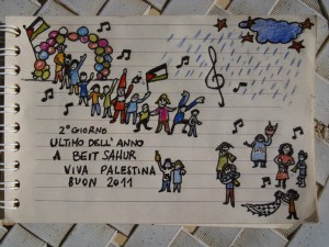 Il centro Amal al Mustakbal di Aida Camp funziona bene, la mattina c’è la scuola per i bambini fino a tre anni, il pomeriggio i corsi di dabka (la danza tradizionale che si balla a tutte le età) e inglese per quelli più grandi. Con i soldi raccolti in italia si stanno facendo molti lavori di ristrutturazione e messa a norma, si pagano le bollette, si cerca di dare un rimborso alle volontarie che ci lavorano. Insieme ai bambini facciamo 2 murales