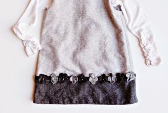 Oggi un vestitino da bimba, un po' elegante, per quando vogliamo essere un po' chic :). Il colore è il grigio, in due tonalità. Che se vogliamo un mini look elegante e chic, col grigio non sbagliamo mai. Qualche fiorellino applicato e naturalmente, per un vestitino elegante, ci vogliono le ballerine di vernice. Un tocco di frivolezza in più, la fascetta rosa con il fiocchetto. Un'idea per questi giorni natalizi di festa.