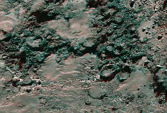 Qui sotto un dettagli 3D della regione Imhotep, basato sulle immagini di OSIRIS acquisite il 22 novembre 2014 da una distanza di 31 chilometri dal centro della cometa. La scala dell'immagine è 56 centimetri/pixel.