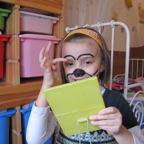 Ci siamo messi nella sua cameretta, io seduto nel tappetone, lei sulla sua renna gonfiabile, abbiamo preso i colori per il trucca bimbi, le salviette struccanti (quelle Biogenya che oltre ad essere ecobio sono anche molto delicate e rimuovono perfettamente anche il trucco tradizionale) uno specchio (e vista l'occasione anche la macchina fotografica) e via con la fantasia.
