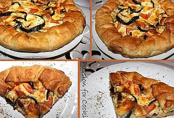 Ieri Agata ha lavorato tutto il giorno, quindi siamo tornati a casa di sera, insieme. Che fare? Nel frigo melanzane, pomodori, mozzarella e... ah, guarda un po', una confezione di pasta sfoglia. Allora facile, si inventa una torta salata per così dire "mediterranea". Agata a dire la verità avrebbe preferito la pasta brisè, ma a mali estremi estremi rimedi. E comunque non è che la pasta sfoglia possa proprio definirsi un male, né un estremo rimedio.