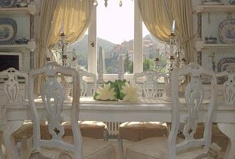 le quali son state create usando delle originali colonnine da altare trovate da me personalmente in un mercatino di Lucca e ridipinte e marmorizzate... con l' aggiunta forse dalle foto non si riesce a vederlo di una cornicetta a merli trovata in un vecchio falegname fiorentino che di per se stessa è un capolavoro per non parlare del tavolo delle sedie e sopratutto delle tende E' indescrivibile l' amore e la cura che abbiamo avuto nella realizzazione di quest' opera che tale si può chiamare e che giuro mi ricorda momenti purtroppo irripetibili..