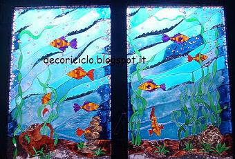 Questa è la finestra del bagno che si trova in casa mia, al piano interrato.Entra comunque una discreta quantità di luce perchè è posizionata in una relativamente ampia "bocca di lupo".Proprio per il fatto che si trova al di sotto del livello del terreno, mi è venuto in mente di decorarla come se si vedesse il fondo del mare.....oltre al fatto che adoro il tema marino (acquatico in generale) come motivo decorativo per il bagno.