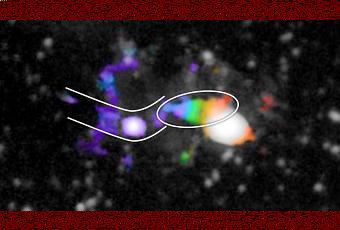 Successivamente, Martin e colleghi si focalizzarono su un determinato intervallo di lunghezze d’onda attorno alla riga di emissione in banda ultravioletta nota come Lyman-alfa. Questa riga, che è una sorta di “impronta digitale” dell’idrogeno atomico, viene di solito utilizzata dagli astronomi come una sorta di indicatore della presenza di materia primordiale. I ricercatori ottennero una serie di spettri che vennero combinati per formare una mappa multifrequenza di una determinata zona di cielo attorno ai due quasar. Questi dati permettono di delineare delle aree ben precise dove il gas emette la riga Lyman-alfa e indicano la velocità con cui il gas si muove rispetto al centro del sistema. “Queste immagini mostrano chiaramente che c’è un disco ruotante. Si vede che un lato si muove verso l’osservatore e l’altro si allontana. Inoltre, si nota che c’è un filamento che si estende al di là del disco”, dice Martin. I dati indicano che il disco sta ruotando ad una velocità di 400 Km/sec, un po’ più velocemente della Via Lattea.