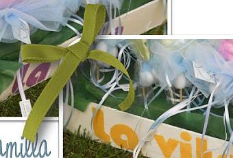 Una nidiata di coniglietti per il Battesimo di mio nipote Gabriele; cominciate prima del terremoto e poi abbandonate per mesi finalmente sono riuscita a finirle, e ne sono entusiasta!Saponette a forma di lecca lecca coniglietto, di varie colorazioni ed essenza: lavanda, vaniglia, arancia, cioccolato e ciliegia.Confezionate con cura, ognuna nel suo sacchettino di cellophane, legato con un nastrino di raso azzurro, i confetti alla mandorla e cioccolato all'interno di due tulle; bianco e azzurro e legati con un nastrino bianco, nel nastrino bianco la tagghettina realizzata con la BIGSHOT e il tutto rifinito con le ETICHETTINE adesive fatte fare apposta per le BOMBONIERE!!Collocate all'interno di due cassettine da frutta, già utilizzate per un'altro battesimo, ma questa volta ho messo sotto alla carta di riso verde dei panetti di spugna da fiorista, così da poterli infilare per farli stare in piedi.