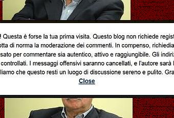 Da questo momento, quando uno dei miei blog sarà aperto da un nuovo visitatore (e SOLO alla prima visita) apparirà un AVVISO (di cui posto uno screen-shot) che indica in maniera sintetica quali sono le regole di accesso al blog. Avverto che l'avviso potrebbe comparire ancora se si cambia browser, o se l'avviso dovesse essere modificato. Mi piacerebbe avere opinioni e suggerimenti. Grazie.