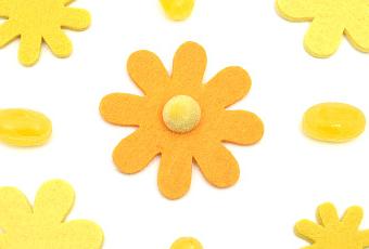 Prendere una striscia di feltro, lana cotta o di pannolenci di un colore a piacere e provvedere con una matita a disegnare sul tessuto una sorta di margherita e su un altro pezzo di tessuto disegnare e ritagliare il cerchiolino del polline.