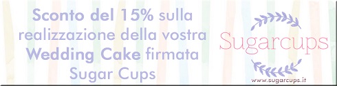 Avete già scelto la vostra Torta Nuziale? Siete alla ricerca di una Wedding Cake davvero unica e che non prosciughi il vostro budget di matrimonio? Beh... Sugar Cups con questo Wedding Coupon offre a tutti gli Sposi una qualità impeccabile, design personalizzato, tasting prematrimoniale per la scelta del gusto finale... il tutto con uno Sconto del 15%!Cos'aspettate? Contattate Sugar Cups tramite il sito: www.sugarcups.it