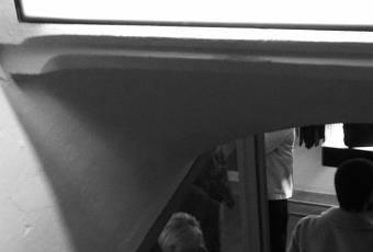 Bianco, nero, la parete “lavagna” sulla quale disegnare, i monitor con le grafiche che scorrono, lo specchio dei camerini che allunga&assottiglia, i mattoncini rossi delle volte…