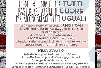 Si svolgerà martedì 21 aprile a Cava de’ Tirreni (Sa) un’incontro informativo sulle Unioni Civili organizzato dalla lista civica “Se non ora quando”. Nel corso dell’incontro si tratterà della legge in discussione in Parlamento a cui seguirà un dibattito sull’importanza di un registro comunale delle Unioni Civili e sulla necessità di abbattere i pregiudizi ancora troppo forti in tutto il paese.