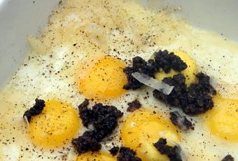 Dividete 60 gr di burro in quattro tegamini individuali, fate sciogliere il burro quindi rompete in ciascun tegamino 4 uova di quaglia, salate e pepate.