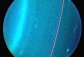 Un’immagine nel vicino infrarosso di Urano che rivela il suo sistema di anelli molto deboli che ruotano in senso inverso. Gli anelli mettono ben in evidenza l’inclinazione di Urano. Credit: Lawrence Sromovsky, (Univ. Wisconsin-Madison), Keck Observatory. Fonte immagine: http://www.europlanet-eu.org/outreach/images/stories/ep/news/epsc2011/morby_uranus_lp.jpg