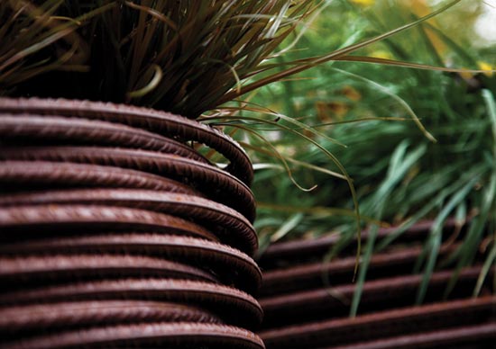 The structure which serves as a composting area and garden store is made entirely from industrial concrete reinforcing bar and is constructed using a technique similar to traditional willow weaving. The construction method minimises any impact on the ground and surrounding mature woodland as the vertical reinforcing rods are driven straight into the ground rather than using traditional foundations. air and sunlight pass naturally through the structure providing ventilation for composting while creating light patterns which change constantly throughout the day.