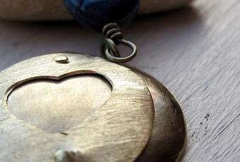 Un piccolo cuore traforato su ottone texturizzato con il Dremel, rivettato su un cerchio di ottone anticato e leggermente imbutito.