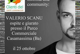 Il 25 ottobre Valerio Scanu sarà ospite e giurato presso il Parco Commerciale Casamassima (BA) col compito di eleggere il vincitore per la gara di canto. Dopo la premiazione del “talent-Show”, il cantante si intratterà con il pubblico per le foto e gli autografi di rito.
