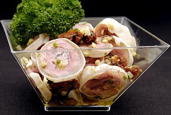 L'idea questa volta è nata dal desiderio di giocare con i colori, in particolare avevo dei pomodori semi secchi, li avevo preparato con il mio fido Essiccatore Tauro per la ricetta degli spaghetti con il pesto di pomodoro essiccato, mandorle e basilico di qualche giorno fa, che volevo abbinare con il sale rosso delle Hawaii e mi son quindi messo a pensare a come completare la ricetta, ho escluso in principio la carne e il pesce perché erano abbinamenti che avevo già fatto, ho quindi optato per una particolare frattaglia: la gola, una parte delle trippe che uso spessissimo, a questo punto mancava una nota croccante! così per caso mi son capitate tra le mani le mandorle e ho pensato che sarebbero andate benissimo, le ho quindi sbucciate, inserite nel Gratì 2.0 (io non lo uso solo per il formaggio) e in un attimo erano li pronte in un piattino da aggiungere al tutto. Il tempo di preparare di preparare la tovaglietta nera per la foto e un Sea Breeze (ottimo drink dal colore rosso e rinfrescante) e questo ottimo finger food faceva bella mostra di se al centro del tavolo. La prova degustazione è stata ottima, la gola come sempre con il suo gusto presente e personale ha dato il meglio di se grazie al gusto solare dei pomodori semi secchi e le mandorle hanno dato il giusto croccante. Un piatto davvero interessante e che ben si abbina ad aperitivi aciduli come il Sea Breeze o il Cape Cod.