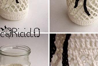 Ho cominciato dal fondo con una lavorazione in tondo, sono poi risalita sui fianchi con un motivo ad archetti che lascia intravedere la trasparenza del vetro, e nella parte superiore ho fatto delle diminuzioni e poi degli aumenti per cercare di seguire la forma del vaso. Come sempre, ho lavorato senza schema e mi scuso se non posso fornire delle indicazioni più precise, ma solo un'idea di massima.
