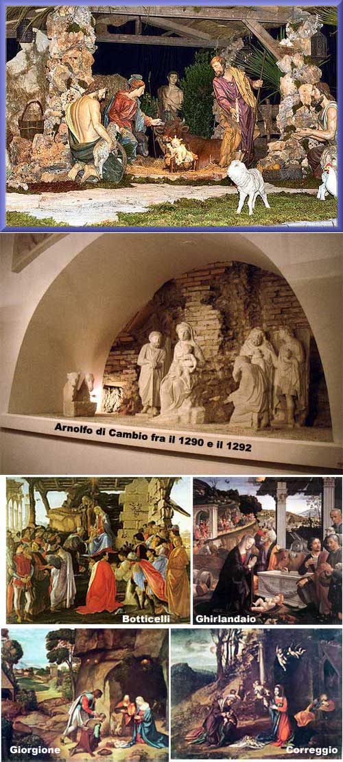 Il primo presepe scolpito di cui si ha notizia è quello realizzato da Arnolfo di Cambio fra il 1290 e il 1292, ne sono rimaste solo alcune statuette conservate nella Basilica di Santa Maria Maggiore a Roma, la vergine originale è andata persa. Nel Quattrocento alcuni famosi pittori che dipinsero la “ Natività” e artisti che si cimentarono nella realizzazione di statuine in terracotta, contribuirono alla diffusione di questa tradizione ampiamente recepita a tutti i livelli e diventata un rito natalizio. Uno dei presepi più antichi, ancora visibile, è quello monumentale della Basilica di Santo Stefano a Bologna.