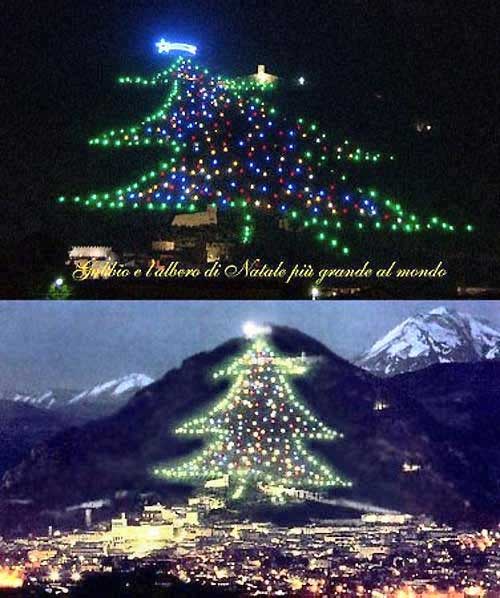 A Gubbio, l'albero di Natale più grande del mondoOgni anno, la sagoma luminosa che riproduce la forma di un abete viene accesa la sera del 7 dicembre sulle pendici del Monte Ingino che sovrasta la città medievale di Gubbio. L’enorme sagoma sale dalle ultime case di pietra del centro storico fino alla Basilica di Sant’Ubaldo, patrono della città, nei cui pressi risplende la stella cometa. La base dell'albero misura 450 mt per un'altezza (verticale) di 500 mt circa con un'estensione (obliqua) di 650 mt circa. (arriva a quota 950 mt). La stella cometa misura 40 mt in lunghezza e 25 in altezza. Ci sono oltre 1040 punti luce al neon di cui 850 sull'albero e 190 sulla stella. La forma dell'albero è disegnata con neon colorati di verde mentre le palle interne sono multicolori, per collegare tutte queste lampade occorrono più di 12 km di cavi elettrici e 1350 prese.
