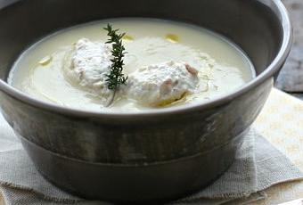Servite la vellutata nei piatti e unite le quenelle come indicato: aiutatevi con due cucchiai per formare la quenelle.
