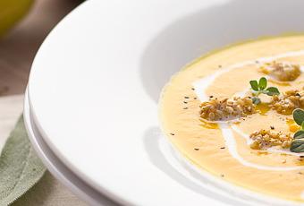 - Servite la vellutata con il tofu croccante al sesamo tagliato a cubetti, alcune foglioline di erbe aromatiche di stagione, un filo d’olio extra vergine, una spolverata di semi di chia e qualche goccio di panna al cocco.
