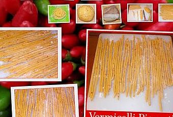 PROCEDIMENTO:In una ciotola capiente,versate la farina,il peperoncino tritato finemente al coltello,le uova,i tuorli,l'olio e il sale.Amalgamate il tutto,prima con una forchetta,poi per qualche minuto con le mani sul tagliere infarinato.Formate un panetto e copritelo prima con carta trasparente,poi con un panno.Lasciate riposare a temperatura ambiente per almeno 1 ora prima dell'utilizzo.Trascorso il tempo di riposo,prendete la pasta e tagliate dei rettangoli da 3x20 cm circa,appiattite poi leggermente con il matterello e da questo rettangolo ottenete delle striscioline di pasta,che fate ruotare sulla spianatoia formando questi vermicelli.Infarinateli bene in modo che non si attacchino al tagliere.