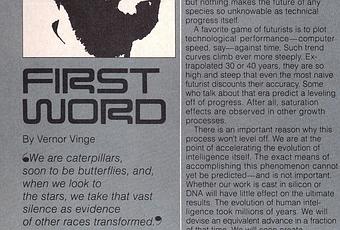 Potrei descriverlo come archeofuturismo, se il termine non avesse sinistre implicazioni. Forse sara' meglio creare un altro neologismo - che ne dite di 'retrofuturologia'? L'immagine qui sopra e' l'articolo, apparso sulla rivista Omni nel 1983, nel quale Vernor Vinge ha per la prima volta usato il termine singolarita'. Lo segnalo per puro interesse "storico" e non traduco, dato che non ci troverete nulla che non sia anche in un suo seguente e piu' approfondito articolo (vedi sotto per la versione italiana, su Estropico.org). Hat-tip a SingularityWebLog.
