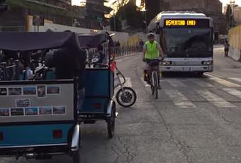 Non solo continuano totalmente indisturbati a svolgere una professione che non esiste e che non ha autorizzazioni, non solo portano turisti in giro senza la minima garanzia e copertura assicurativa, non solo operano nonostante i Vigili Urbani abbiano promesso di non dar loro tregua (e invece non fanno niente), non solo adescano i turisti urlando "taxi, taxi, taxi" cosa che dovrebbe far incaxxare di brutto i tassisti che invece appaiono essere abbastanza tolleranti, ma i terrificanti finti risciò (sono fasulli, in realtà hanno un motorino elettrico con tanto di batterie!) guidati ora da avanzi di galera, ora da personaggi inqualificabili (i peggiori biglietti da visita per i nostri turisti), ora da ragazzini forse anche minorenni, continuano ad occupare tutta la carreggiata di Via dei Fori Imperiali e di Piazza del Colosseo rendendo impossibile la vita alle tante biciclette di passaggio. Basta guardare questi video per capirlo. E bisogna guardare questi guidatori di finti risciò spaparanzati con le chiappe o la panza di fuori per capire a che livello di impunità, cattivo gusto e sopruso siamo arrivati.