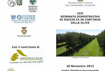 La Giornata, giunta alla VIII edizione, si propone di illustrare le attività di ricerca e sperimentazione condotte da ricercatori del DiSAAT dell’Università degli Studi di Bari sul sistema di olivicoltura ad alta densità. Questo innovativo sistema colturale, che ormai affianca l’olivicoltura tradizionale ed intensiva anche in Puglia, consente un drastico abbattimento del fabbisogno della sempre più rara e costosa manodopera e, quindi, di ridurre notevolmente i costi di produzione dell’olio extravergine di oliva. Nel corso della Giornata si potranno osservare e valutare sviluppo, portamento, produttività e risposta alla raccolta meccanica in continuo di olivi di otto anni di età e di 15 differenti cultivar: Arbequina, Arbosana, Carolea, Cima di Bitonto, Coratina, Don CarloÒ, Frantoio, Fs-17Ò, I/77Ò, Koroneiki, Leccino, Maurino, Nociara, Peranzana e UranoÒ L’oliveto sperimentale è stato realizzato nel 2006 con piante da talea e/o da micropropagazione e sesto di impianto di 4,0 m x 1,5 m (1.667 alberi per ettaro). L’impianto è entrato in produzione nel 2008, al terzo anno dalla messa a dimora, e la raccolta 2013 è la sesta consecutiva. La raccoglitrice-scavallatrice è una Pellenc modello 4560. Segreteria organizzativa DiSAAT Salvatore Camposeo Francesco Bellomo Biagio Bianchi Simone Pascuzzi tel./fax 0805442982 [email protected] [email protected] [email protected] [email protected] Programma Ore 9,00 Interventi Giacomo Scarascia M ugnozza Direttore del DiSAAT - Università di Bari Francesco Guglielmi Presidente di Assoproli Bari Fausto Balducci Direttore di Superinnova Salvatore Camposeo Ricercatore di Coltivazioni Arboree - Università di Bari Ore 10,00 Prova dimostrativa di raccolta in continuo delle olive