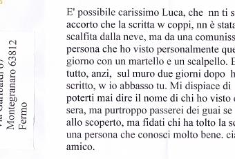 E’ arrivata oggi, il timbro postale porta la data del 14 marzo, è stampata con una stampante inkjet o, forse, laser, non è firmata e non ci sono indizi su chi possa essere l’autore. Certamente è qualcuno che ha seguito bene la vicenda della scritta “Viva Coppi”. Sull’attendibilità del contenuto di questa lettera anonima non mi esprimerò ma rimane, comunque, inquietante. Inquietante è l’idea di qualcuno armato di scalpello che distrugge una cosa preziosa forse solo per far dispetto a me. Inquietante è questo clima da mafia che a Montegranaro non siamo abituati a respirare. Di fatto la scritta “viva io abbasso te” c’è.