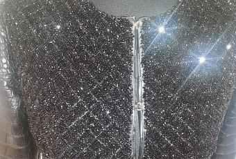 Ritornano prepotenti gli intarsi in pelle che vanno a sdrammatizzare bikers, giacche e cappottini in un impalpabile pitone e un più strutturato coccodrillo, a volte impreziositi da dettagli in visone o che vanno a creare una parte importante del capo, come il cappottino a strisce bianche e nere in visone che si trasformano scendendo verso il basso in intarsi di pelle degli stessi colori. Non poteva mancare la pelliccia, come il gilet con un mini corpetto in coccodrillo che sfuma nel cincillà o ancora un cappottino in un leggerissimo visone champagne, con intarsi neri, che ritorna nella parte inferiore del cappottino in morbido pitone. Una pelle pregiata, il pitone, anche per una gonna ruota nera dall’aria retrò ma dalla personalità proiettata verso il futuro. Intarsi non solo nel più classico bianco e nero, ma anche nel più fresco bianco e blu che mixati con il pitone blu danno vita a un biker aggressivo e una giacca di carattere da addolcire con una longuette, nelle stesse tonalità. E ancora intarsi bianco e biscotto per giacche, gonne e pantaloni a vita alta per un look forte e determinato, ma alleggerito da tonalità chiare. Una nota accesa, le due giacche in pitone viola, colore che ritorna anche nell’intarsio, abbinato a un acceso arancio. Due capi preziosi vanno a completare la collezione: una giacca in coccodrillo nero reso brillante da pietre, in taglio diamante, presenti sui polsini e sulle spalle e un cappottino, sempre in coccodrillo nero, dal corpetto completamente ricamato con cristalli neri che creano un delicatissimo gioco di piccoli rombi.
