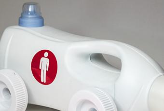 Si tratta di un'auto interamente realizzata con pezzi riciclati: un flacone di detersivo, tappi, perni recuperati dagli scarti di un 'azienda meccanica rifilettati a mano, e pennarelli esausti. In più vengono aggiunti anche degli adesivi colorati per personalizzare la propria auto.Per renderla più pesante e adatta a tutte le superfici, viene consigliato di riempire il flacone con un po' di terra, sabbia o di acqua …se siete al mare!