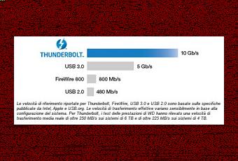 Thunderbolt è il nome di una tecnologia sviluppata da Intel in collaborazione con Apple, con il semplice scopo di collegare la più vasta gamma di dispositivi, tra cui fotocamere, monitor, dischi rigidi, unità di memorizzazione e quant’altro, ad altissima velocità, 10 Gbit/s bidirezionali. Non stupisce assolutamente la scelta di Apple di dotare, almeno per ora, tutti i suoi computer con questa innovativa interfaccia, e “snobbare” la usb 3.0.