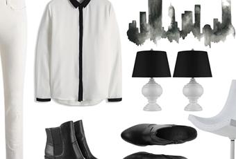 Un jeans stretch, skinny di color bianco sporco con dei piccoli dettagli "consumati" sulla gamba da abbinare ad una camicetta bon ton, bianca dalle rifiniture nere. La camicia può essere inserita completamente dentro al pantalone o solo nella sua parte anteriore. Uno stivaletto nero dal tacco comodo e largo completa il tutto. Perfetto per qualsiasi occasione.
