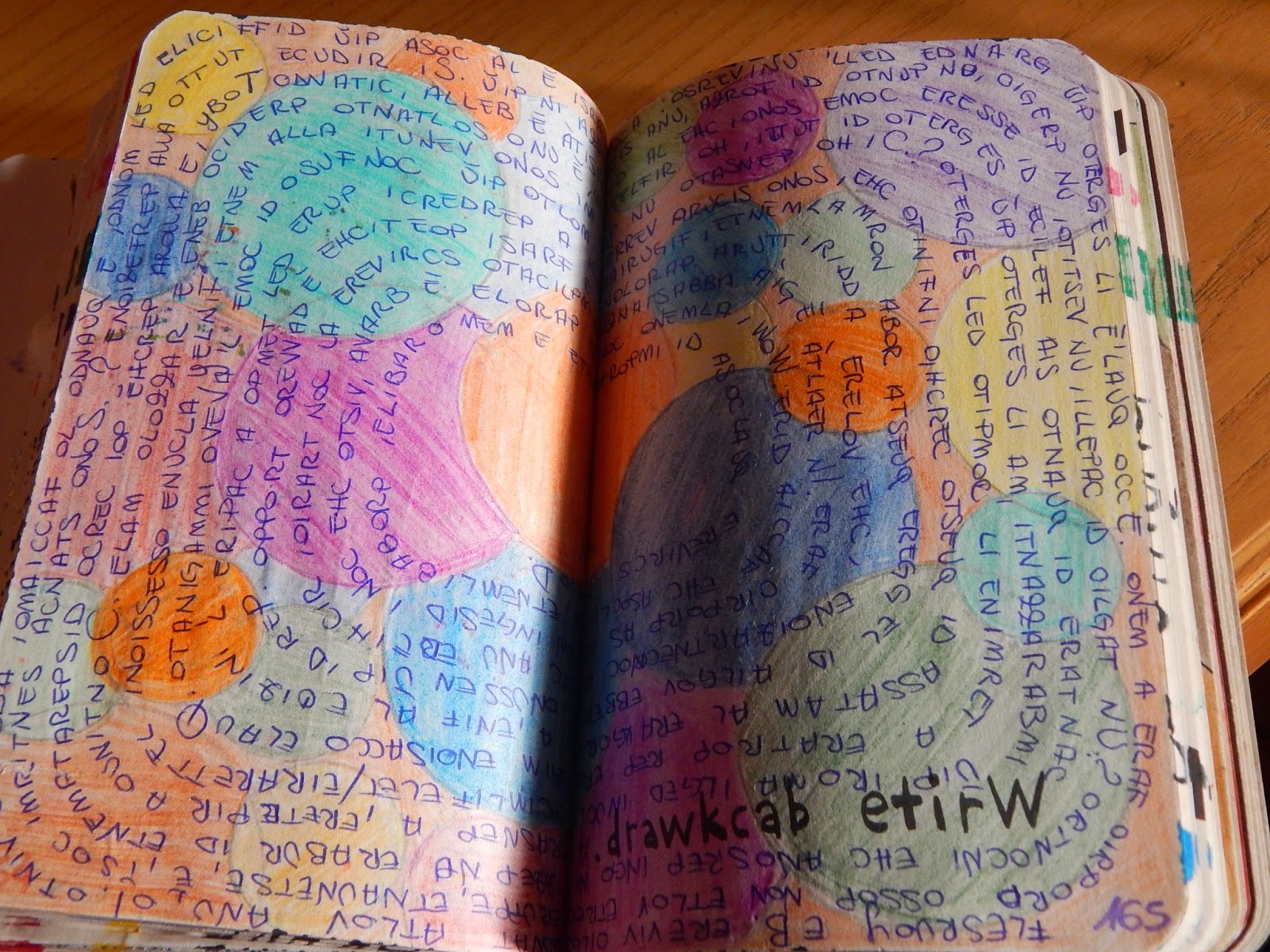 Qui dovevo scrivere al contrario, e la cosa non è stata affatto facile, visto che, tanto per complicarmi ulteriormente la vita, ho deciso di scrivere a spirale. Forse non si nota bene, ma ho scritto al contrario e in tondo, tutto un bel discorsetto che ora è indecifrabile!