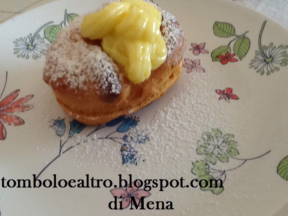 Altrimenti, classica,tagliare a metà la zeppola farcire e guarnire con crema pasticcera e una spolverata di zucchero a velo ( non ci sono le classiche amarene perché non piacciono ai miei uomini)