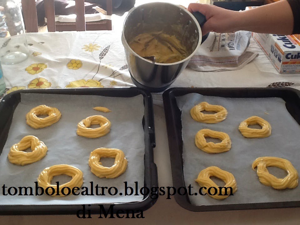 Inserire nel boccale acqua, sale e burro: 5 min. 100° vel. 1. Al termine aggiungere dal foro del coperchio, la farina: 20 sec. vel. 4. Cuocere: 6 min. 90° vel. 3. Togliere dal boccale e lasciare raffreddare bene l’impasto. Unire dal foro del coperchio con lame in movimento a vel. 4, le uova una per volta: 30 sec. vel. 6. Con una siringa col bocchettone a stella, fare due giri di pasta sovrapposti con un buco al centro.