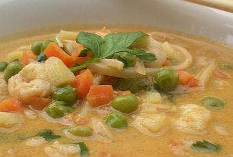 Una volta saltate le verdure unite i liquidi: brodo, latte di cocco e la pasta di curry lasciate cuocere per 10 minuti da quando avrà preso il bollore. Unite la salsa di soia, la salsa di pesce e i noodles e cuocete per il tempo necessario. Due minuti prima de termine della cottura aggiungete i gamberi e i germogli di soia, lasciate cuocere ancora pochi minuti e servite la zuppa cosparsa di coriandolo tritato.